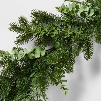 Bring realistic greenery to your holiday decor with this Mixed Pine and Eucalyptus Garland from Threshold™ designed with Studio McGee. This 72-inch garland features an artificial foliage of mixed pine branches and eucalyptus leaves for a natural-themed festive look. Drape the garland on the fireplace mantel, place on a console or display on a wall anywhere inside your home.