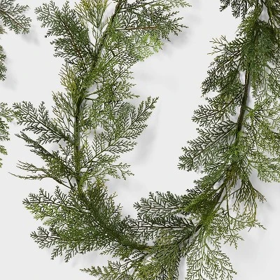 Decorate your home with ease this holiday season with this XL Cedar Garland from Thresholdâ„¢ designed with Studio McGee. This artificial Christmas garland is adorned with green cypress branches for a natural-themed festive look. Drape the garland on the fireplace mantel or display on a wall or door frame inside your home.