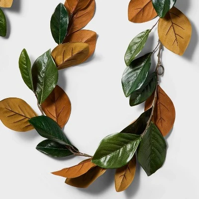 Add a natural texture and look to your seasonal decorations with this XL Magnolia Leaf Garland from Thresholdâ„¢ designed with Studio McGee. This artificial Christmas garland features an arrangement of overlapping magnolia leaves in green and fall-themed colors. Drape the garland on the fireplace mantel or display on a wall or door frame inside your home.