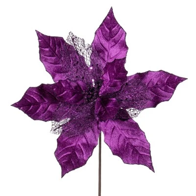 Vickerman 11″ Plum Velvet and Glitter Mesh Poinsettia Flower on Stem. Includes 6 pieces per bag. It measures 11 inches from top to bottom.
