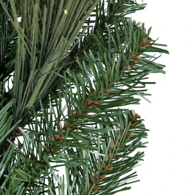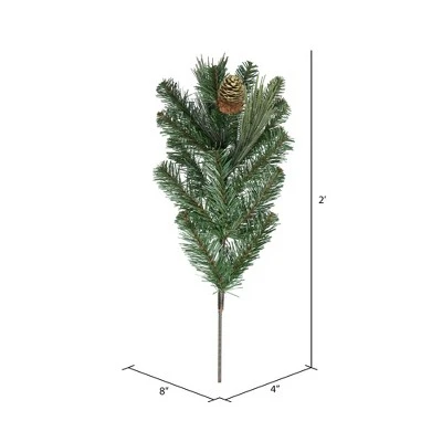 Vickerman 24″ Emerald Mixed Fir Artificial Christmas Spray featuring 19 Flocked PVC and PE/Hardneedle Tips with 1 Pine Cone. This decorative spray comes 4 per bag and is recommended for indoor use only.