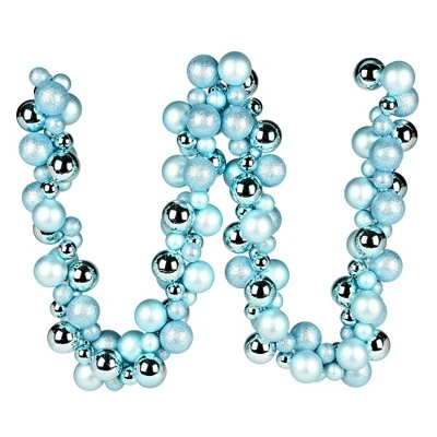 Vickerman 6′ Assorted Ornament Ball Christmas Garland. The ornament sizes are a mixture of 1 and 2 inches, and include finishes of shiny, matte, and glitter. Ornaments are made with shatterproof plastic to reduce the likelihood of breaking when dropped.