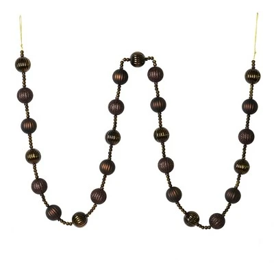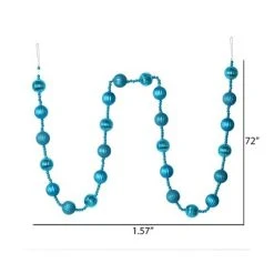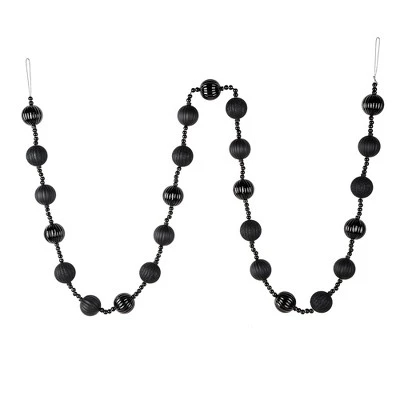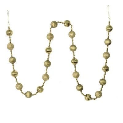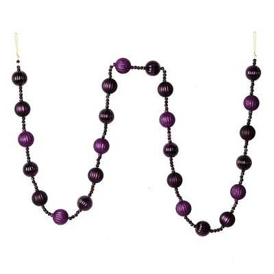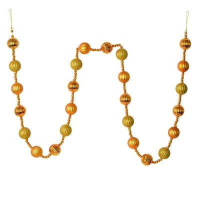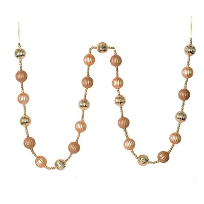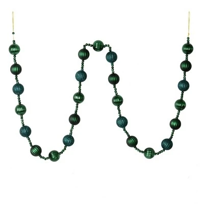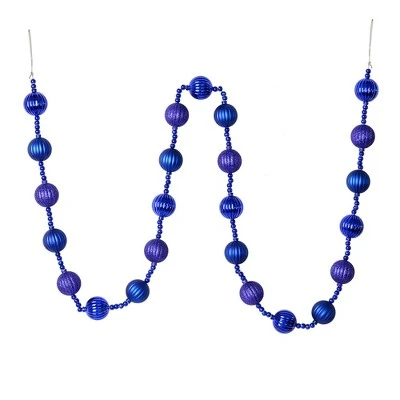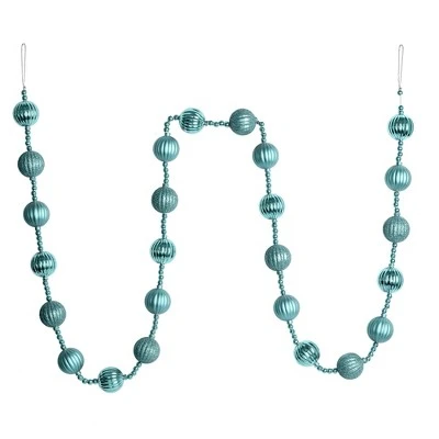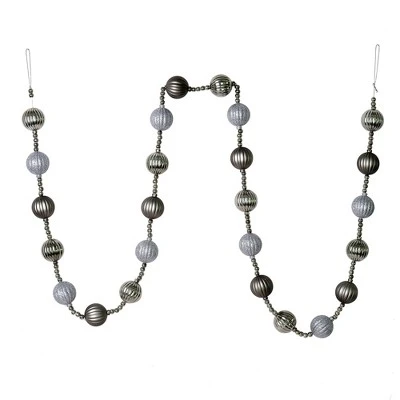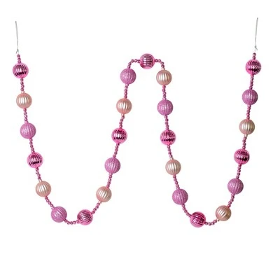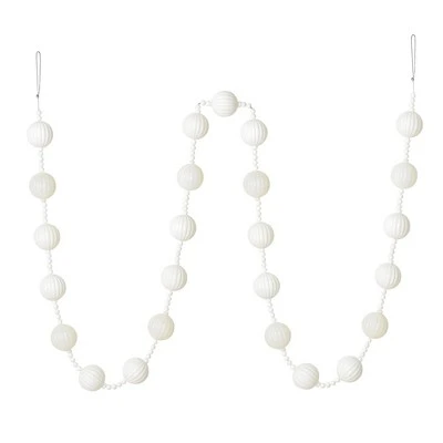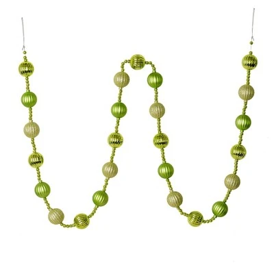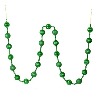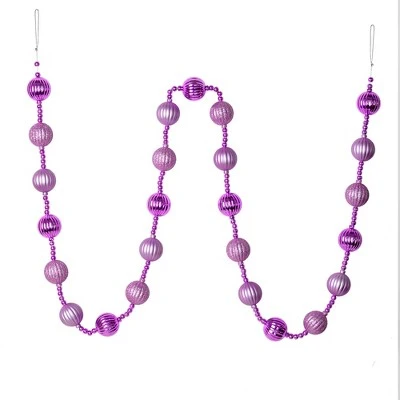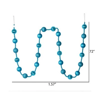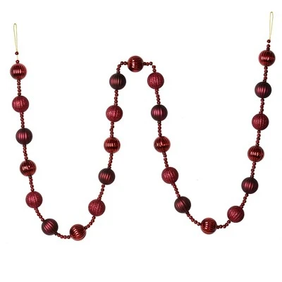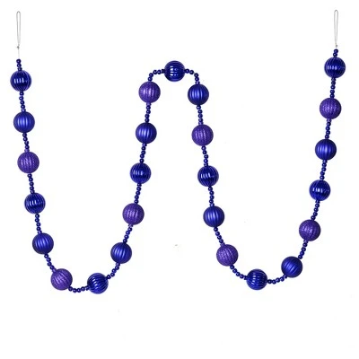 Vickerman 6′ Stripe Ball Garland. This garland features 40mm ornaments in a mixture of shiny, matte and glitter finishes. The large ornaments feature a line design. This ornament garland is perfect for hanging on a holiday tree or mantle.