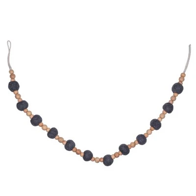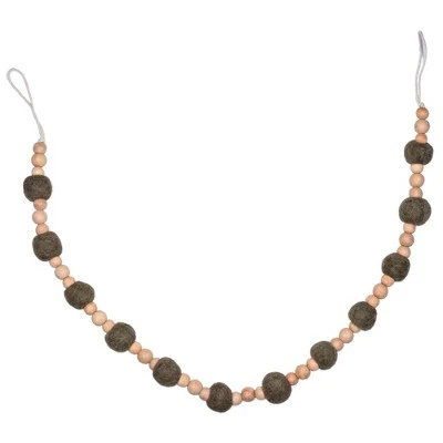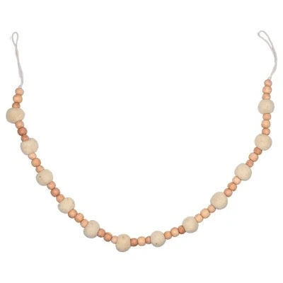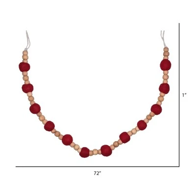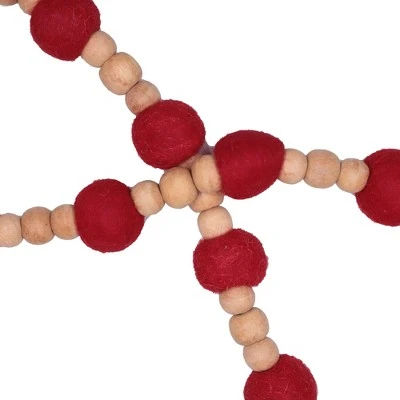 Vickerman Wood and Felt Pom Pom Garland. This garland features a mixture of wool and wooden beads. It measures 72 inches in length. It features a loop at each end for easy decorating.