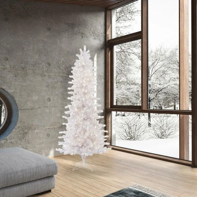 Vickerman Crystal White Pine Slim Artificial Christmas Tree with PVC tips. A wonderful alternative to the traditional green Christmas tree, this brilliant tree has white PVC tips on metal hinged branches, and a tree stand is included.