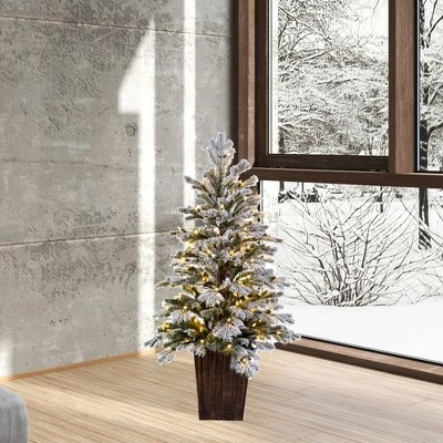 Vickerman Potted Flocked Comet Pine Tree Artificial Christmas Tree, featuring flocked PE tips and comes fixed in a decorative resin pot.