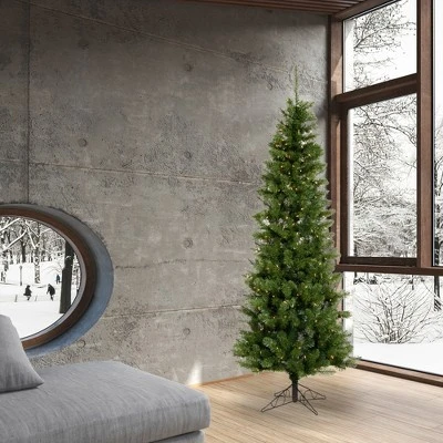 Vickerman Salem Pencil Pine Artificial Christmas Tree featuring PVC tips. This tree is made with beautiful green PVC tips on metal hinged branches and comes with a metal tree stand.